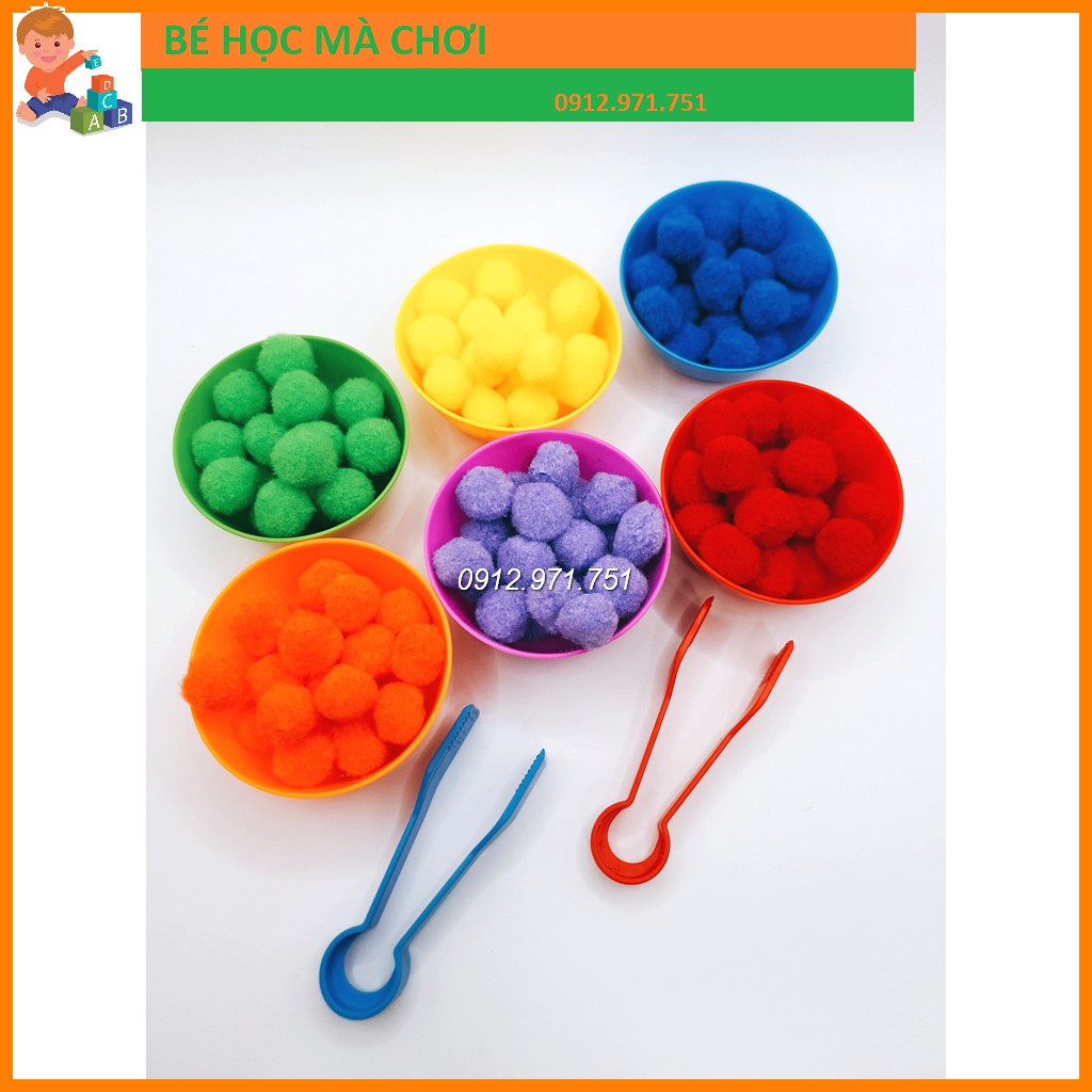 Set bát + pompom : gồm 6 bát, 2 kẹp, pompom 6 mầu cỡ 2cm đựng đầy bát như ảnh, siêu rẻ, chơi siêu thích