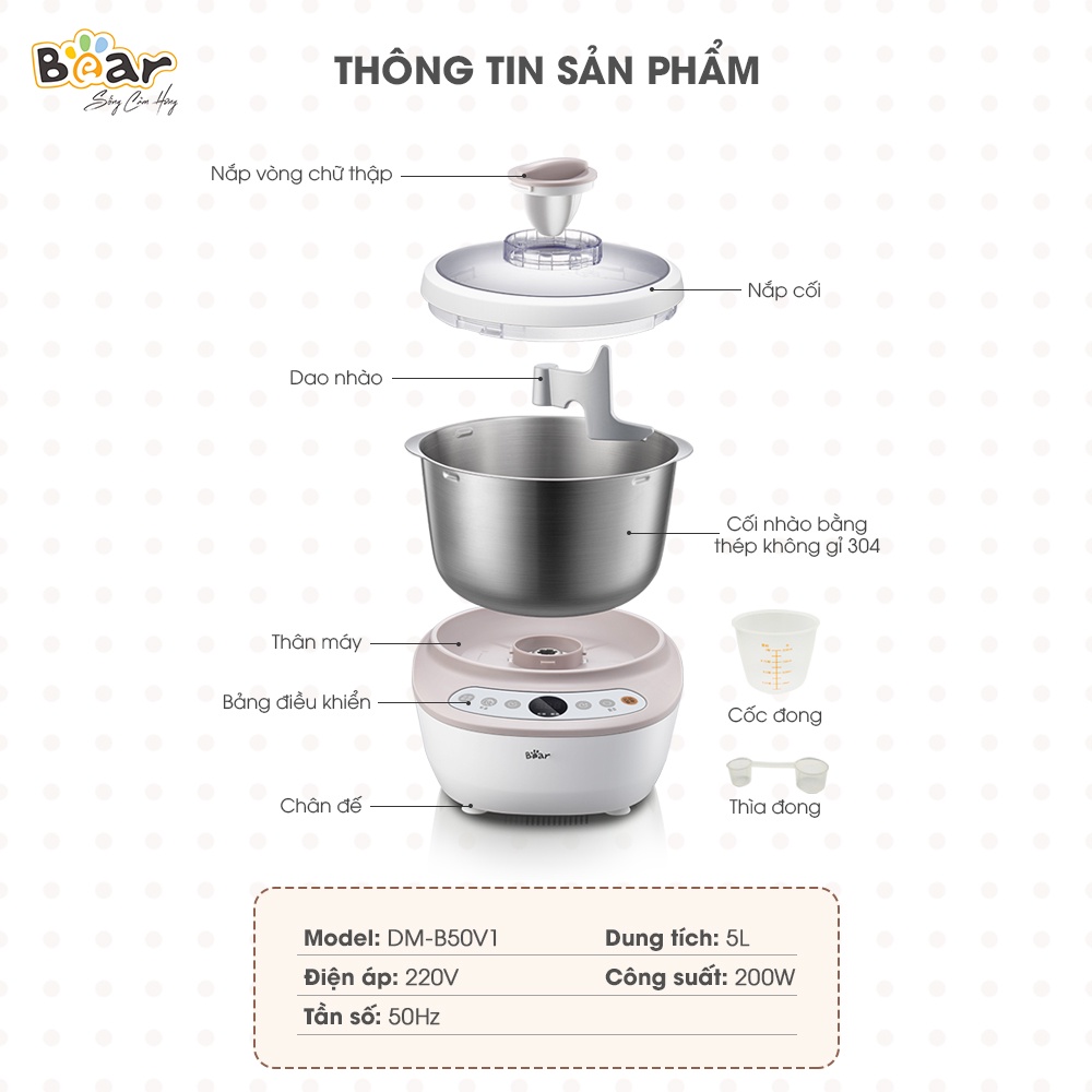 Giới thiệu [Bear Chính Hãng]Máy trộn bột Bear 5L DM-B50V1 công suất 200W, dung tích 5L bằng ABS, Inox 304, hợp kim nhôm.