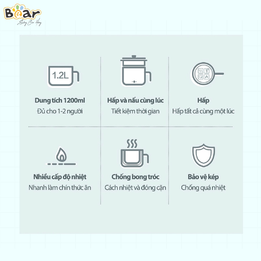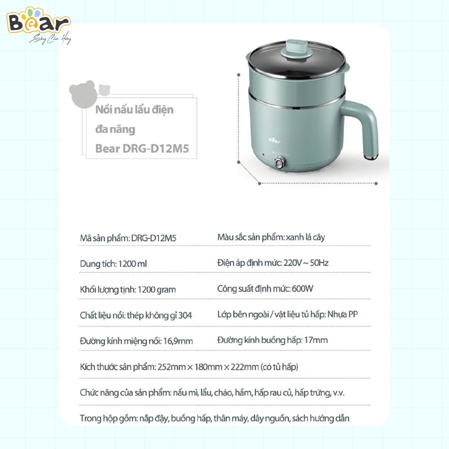 Giới thiệu [Bear Chính Hãng] Nồi đa năng mini Bear DRG-D12M5 – Xanh lá nhạt với ông suất lớn 600W kết hợp với 2 mức nhiệt.