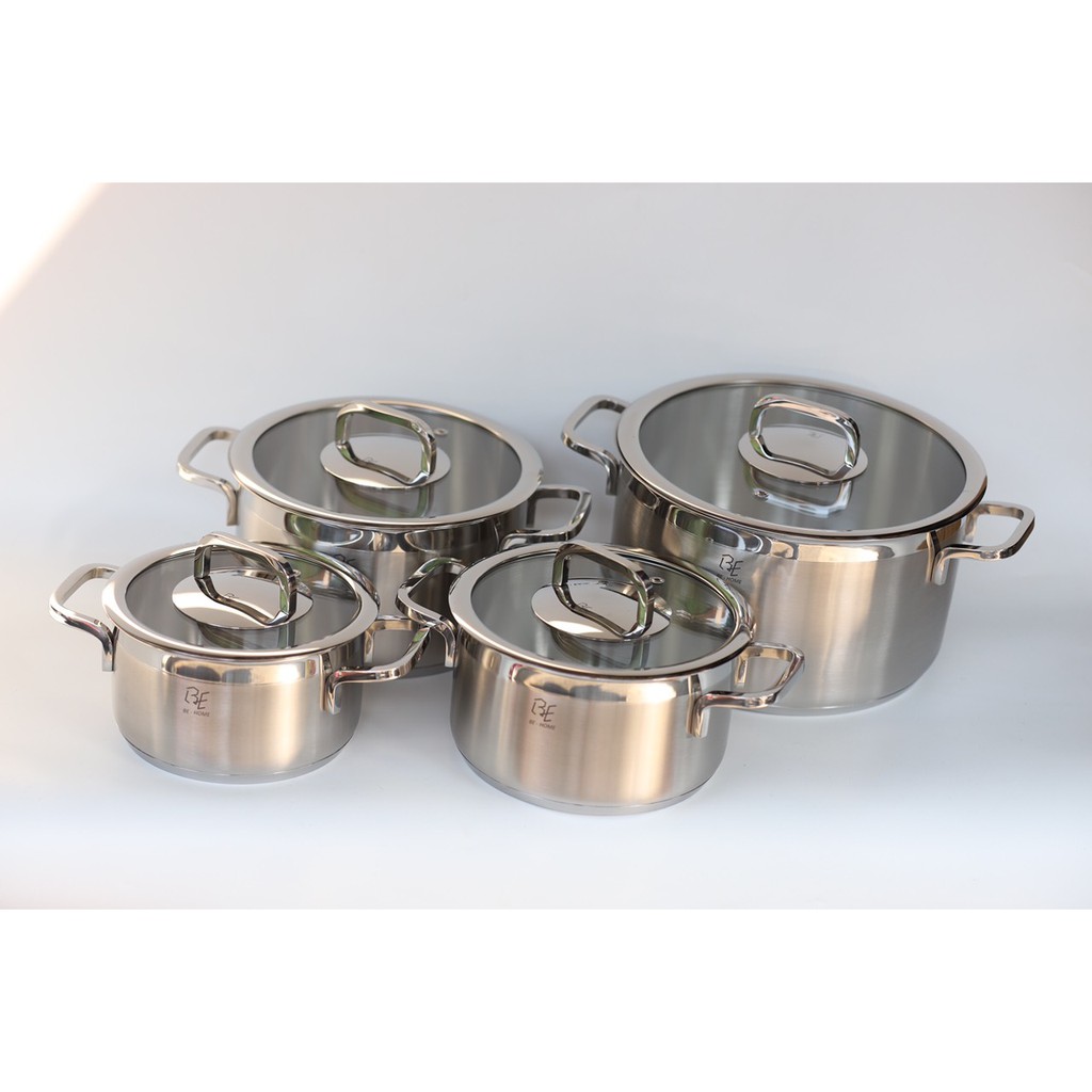 Bộ Behome 4 chiếc vung kính - Inox 304Bộ nồi Inox Behome 4 món là sản phẩm bộ nồi cao cấp, kiểu dáng sang trọng và hiện đại phù hợp với mọi không gian bếp gia đình Việt. Chất liệu bộ nồi làm bằng Inox 304 cao cấp an toàn cho sức khỏe người sử dụng. Với nhiều kích cỡ khác nhau, các bà nội trợ có thể thỏa sức chế biến món ngon cho cả gia đình.