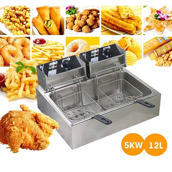 – Bếp chiên nhúng điện đôi 2 giỏ 6X2 lít: bếp chiên khoai tây, chiên gà, đùi gà, cánh gà, xúc xích, thịt bò... Bếp chiên đa năng thiết kế bằng inox không rỉ, có thể tháo rời dễ dàng thuận lợi cho vệ sinh.