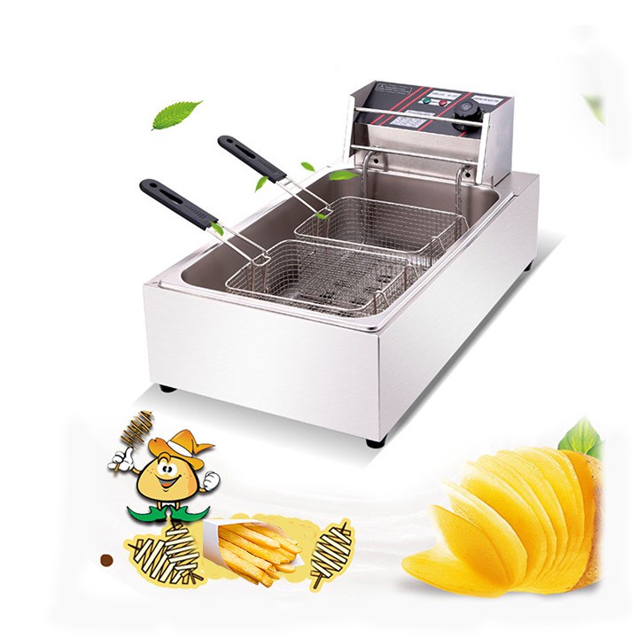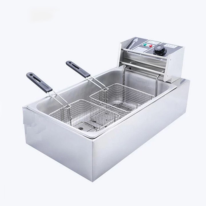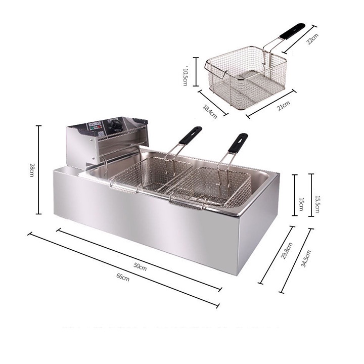 – Bếp chiên nhúng điện đôi 12 lít: bếp chiên khoai tây, chiên gà, đùi gà, cánh gà, xúc xích, thịt bò... Bếp chiên đa năng thiết kế bằng inox không rỉ, có thể tháo rời dễ dàng thuận lợi cho vệ sinh.