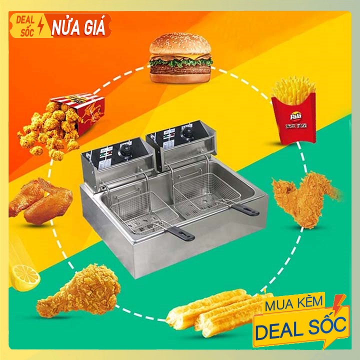 - Bếp chiên nhúng đôi có thể coi là loại bếp chiên điện được các cửa hàng, nhà hàng, quán bán đồ ăn vặt lựa chọn đầu tiên để dùng chiên, rán các món ăn nhanh như: Mực, tôm, cá, bò, thịt xiên, khoai, gà rán,..- Thông số kỹ thuật bếp chiên đôi: