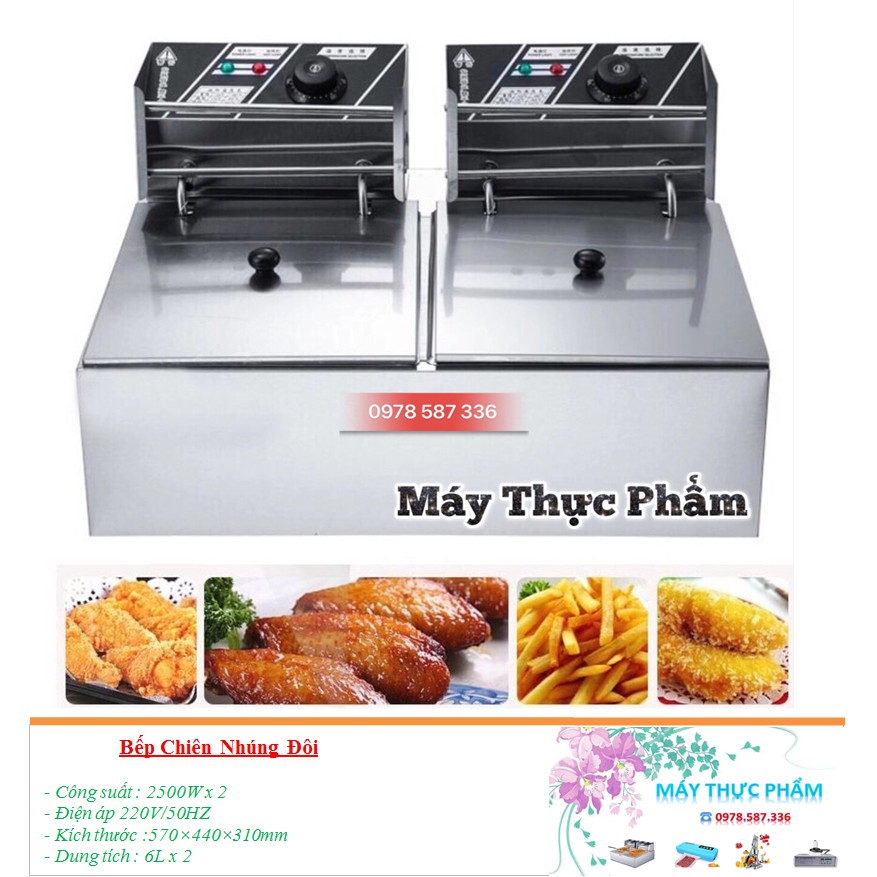 – Bếp chiên nhúng điện đôi 2 giỏ 6X2 lít: bếp chiên khoai tây, chiên gà, đùi gà, cánh gà, xúc xích, thịt bò... Bếp chiên đa năng thiết kế bằng inox không rỉ, có thể tháo rời dễ dàng thuận lợi cho vệ sinh.