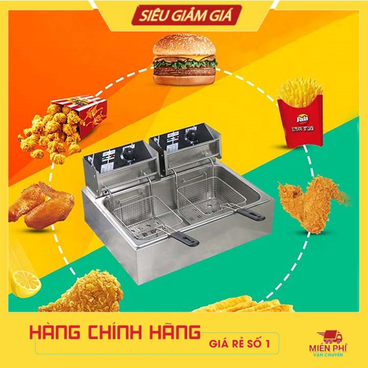 – Bếp chiên nhúng điện đôi 2 giỏ 6X2 lít: bếp chiên khoai tây, chiên gà, đùi gà, cánh gà, xúc xích, thịt bò... Bếp chiên đa năng thiết kế bằng inox không rỉ, có thể tháo rời dễ dàng thuận lợi cho vệ sinh.