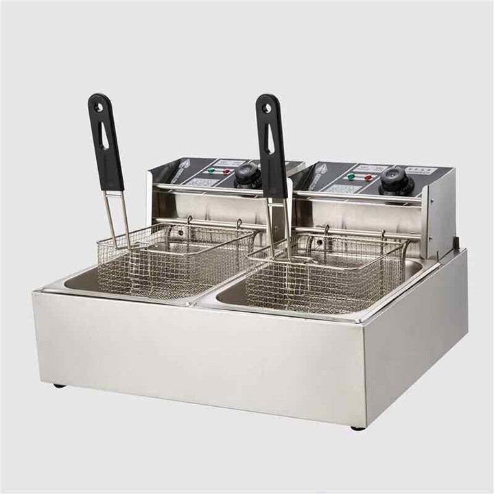 - Bếp chiên nhúng đôi có thể coi là loại bếp chiên điện được các cửa hàng, nhà hàng, quán bán đồ ăn vặt lựa chọn đầu tiên để dùng chiên, rán các món ăn nhanh như: Mực, tôm, cá, bò, thịt xiên, khoai, gà rán,..