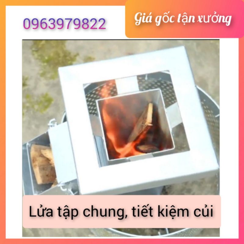 Bếp đun củi được thiết kế theo hình chữ V với 1 đầu vào củi và 1 đầu ra lửa được làm theo dạng trụ, giúp kín gió từ đó dồn nhiệt giúp đồ ăn chín nhanh và tốn rất ít củi. Sản phẩm được thiết kế có vành đai chống bỏng,rất an toàn , đây là 1 điểm nổi trội của sản phẩm so với thị trường. Và là dòng bếp củi dã ngoại vô cùng thích hợp.