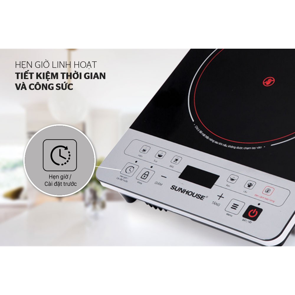 Bếp hồng ngoại SUNHOUSE SHD6005 có chế độ hẹn giờ bật trước 24 giờ và cài đặt tắt trước 4 giờ giúp người dùng tiết kiệm được thời gian trông coi.