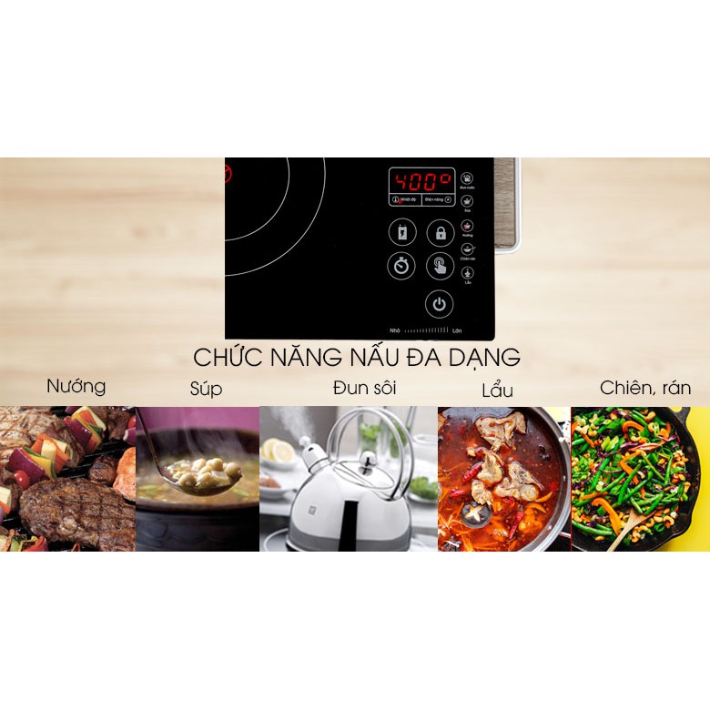 Bao gồm nướng, chiên, nấu nước, nấu lẩu và nấu súp đi kèm tính năng tăng giảm nhiệt độ cho bạn nhiều sự lựa chọn chế độ nấu và mức nhiệt độ phù hợp với từng món ăn và mục đích sử dụng khác nhau. Bếp chỉ có 1 vòng nhiệt nên không thể điều khiển nhiệt độ tuỳ loại nồi.