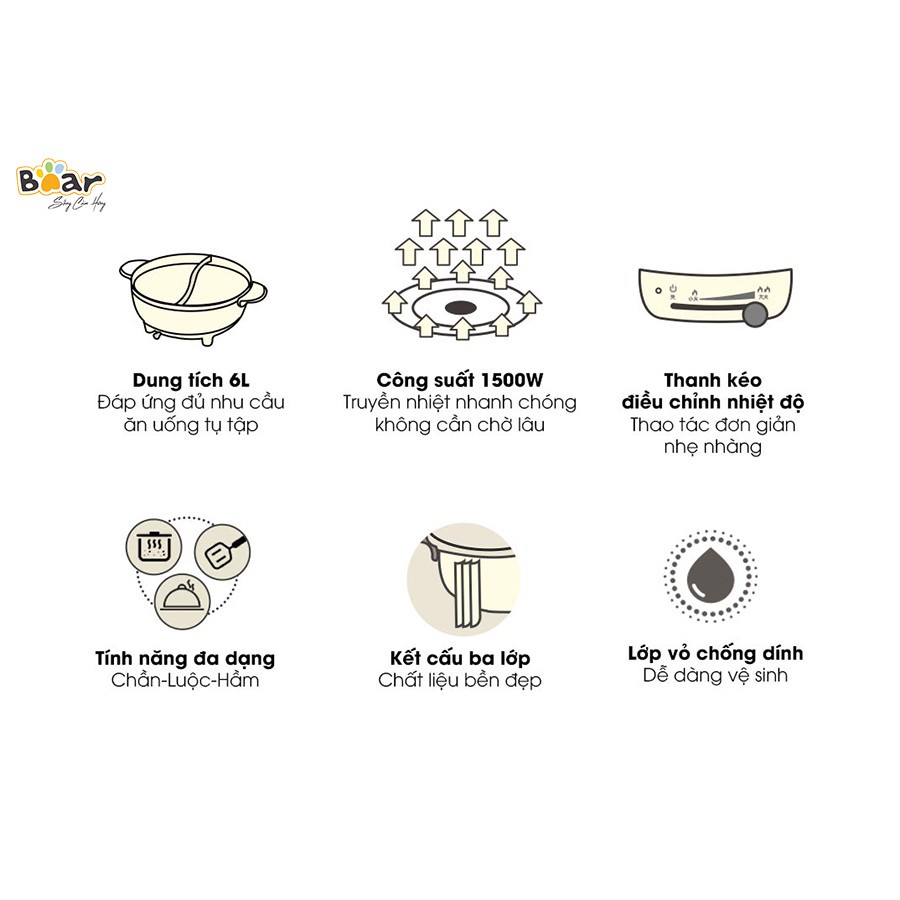 Nồi lẩu 2 ngăn đa năng Bear DHG-B60R6 dung tích 6L thiết kế thông minh an toàn phù hợp cho gia đìnhNồi lẩu 2 ngăn đa năng Bear DHG-B60R6 với dung tích lớn, thiết kế thông minh và bền bỉ phù hợp dùng cho gia đình là lựa chọn tuyệt vời cho những bữa ăn tụ họp ấm áp của gia đình Việt.