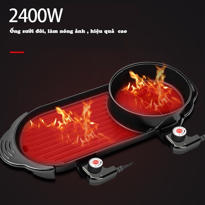 - Tiết kiệm điện với 2 núm điều chỉnh nhiệt độ cho nồi lẩu và bếp nướng
