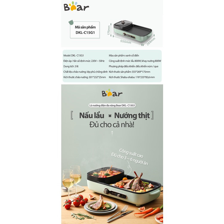 Giới thiệu [Mã ELHADEV giảm 4% đơn 300K] Bếp Lẩu Nướng Đa Năng BEAR DKL C15G1 2 In 1 Dành Cho Gia Đình