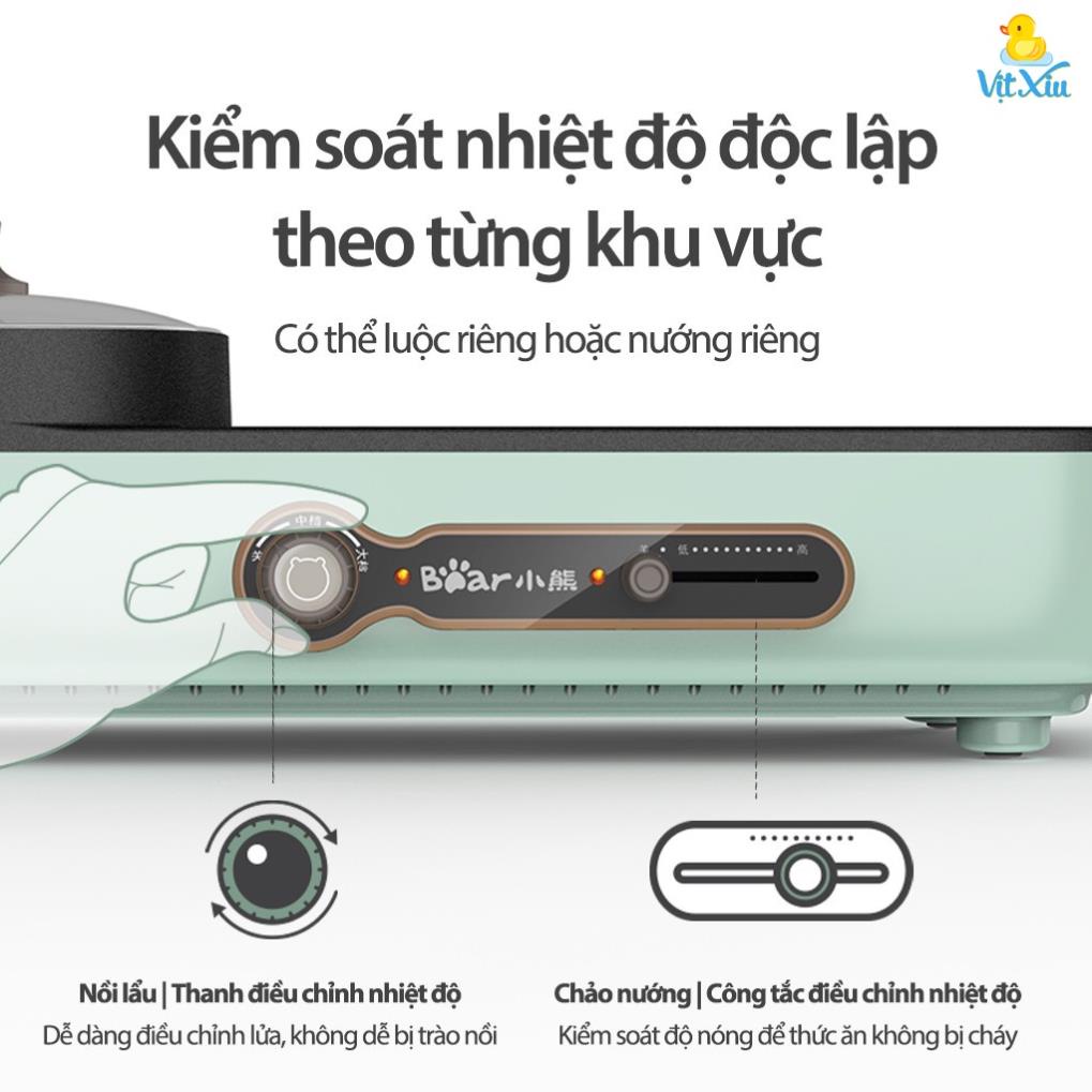 Chiếc bếp nướng và lẩu đa năng Bear DKL-C15G1 được hãng trang bị 2 bộ kiểm soát nhiệt độ riêng biệt, người dùng có thể hoàn toàn chủ động trong việc kiểm soát nhiệt đó của từng phần nấu. Đây là ưu điểm lớn của Bear DKL-C15G1, khác biệt với những sản phẩm nồi lẩu và nướng trên thị trường hiện nay.
