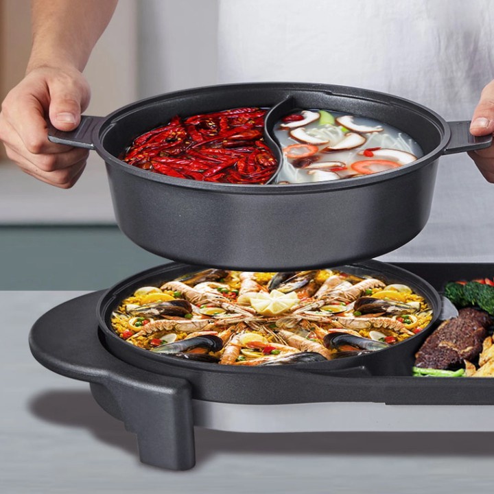- Bếp lẩu nướng điện thiết kế độc đáo kết hợp giữa nướng và lẩu trên cùng một bếp, tiết kiệm không gian và thời gian cũng như nguyên liệu, bếp lẩu nướng đa năng, có khay hứng dầu mỡ hạn chế việc dầu ra ngoài đồng thời giúp thức ăn không bị ngấm dầu. Đặc biệt nồi lẩu có thể tháo rời, giúp thuận tiện vệ sinh