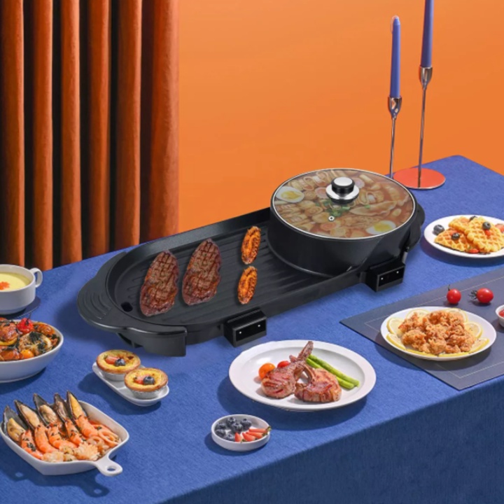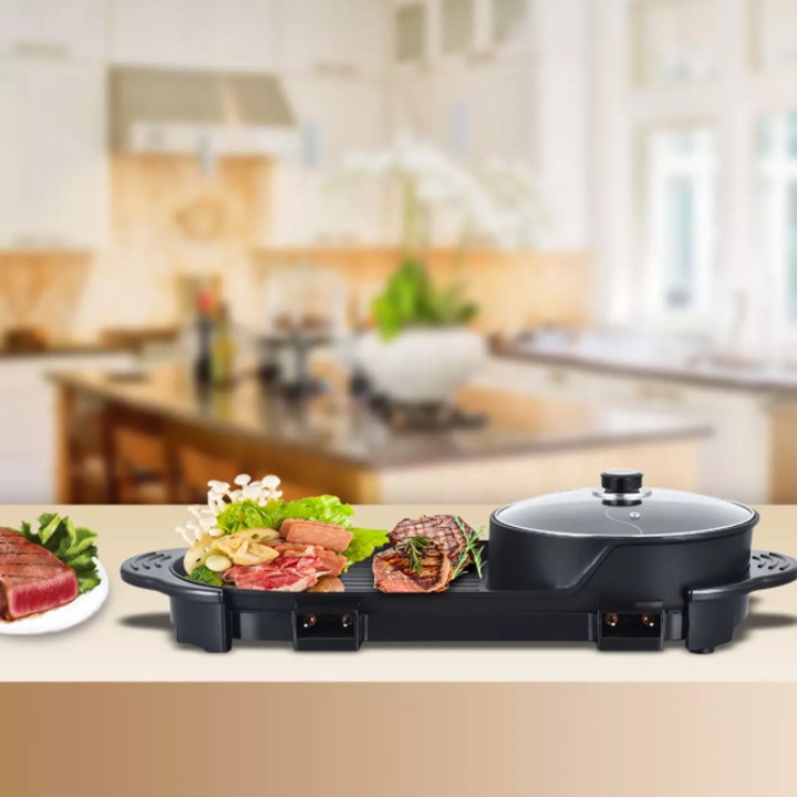 Bếp lẩu nướng điện đa năng kết hợp 2 trong 1 chống dính, công suất 2200W, Electric Grill with Hot PotCòn gì tuyệt vời hơn khi được cùng gia đình, bạn bè ngồi quây quần bên nhau và thưởng thức lẩu và nướng.Tuy nhiên để chế biến hai món đó lại mất khá nhiều thời gian và công sức. Hiểu được nhu cầu đó các nhà sản xuất đã cho ra đời sản phẩm bếp lẩu nướng hai trong một với nồi lẩu 2 ngăn. Một thiết bị tích hợp hai tính năng, bạn có thế vừ nấu lẩu vừa làm đồ nướng.