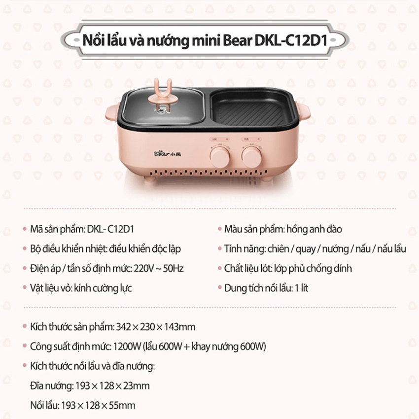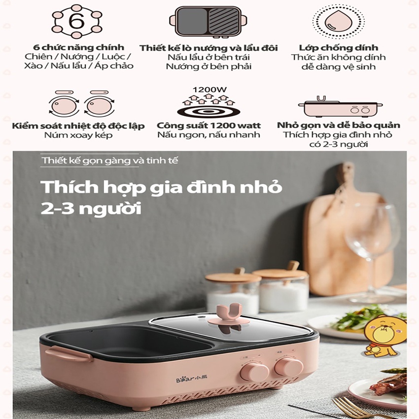 Bếp lẩu nướng mini 2 ngăn (Lẩu và nướng) Bear DKL-C12D1, dung tích 1500ml, công suất 1200W (Hàng chính hãng 1 đổi 1 trong 30 ngày, bảo hành 18 tháng)THÔNG TIN SẢN PHẨM
