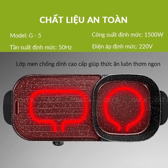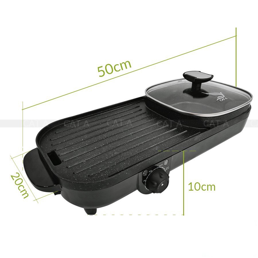 - Tiết kiệm điện với 2 núm điều chỉnh nhiệt độ cho nồi lẩu và bếp nướng