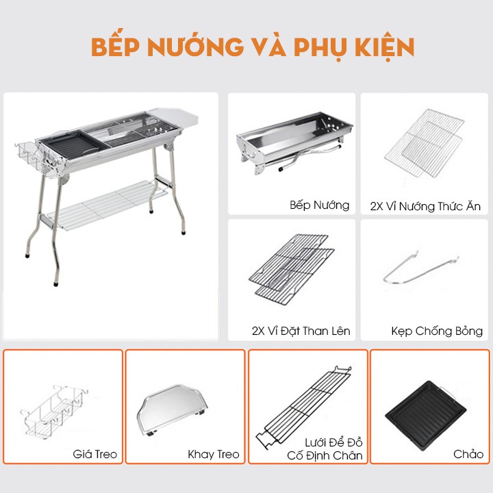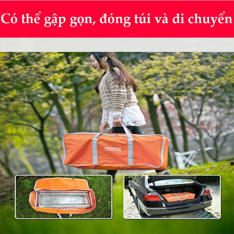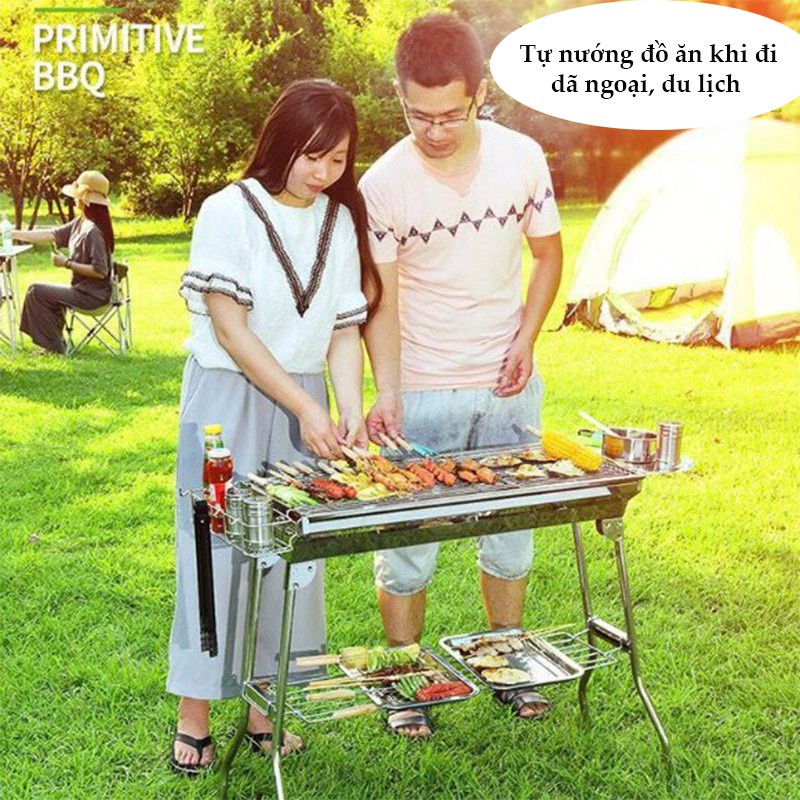Bếp nướng BBQ ngoài trời dã ngoại nướng than hoa inox có thể gấp gọn chân cao xếp kèm phụ kiện