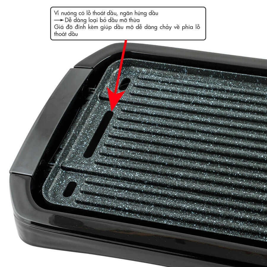 Bề mặt vỉ nướng có lỗ thoát dầu và bên dưới vỉ có ngăn hứng dầu, giúp dễ dàng loại bỏ dầu mỡ thừa khi đang nướng. Đồng thời, vỉ nướng được đính kèm theo giá đỡ, giúp nâng một bên vỉ nướng (bên cắm bộ điều nhiệt) cao hơn bên còn lại (bên có lỗ thoát dầu) để dầu mỡ có thể dễ dàng chảy về phía lỗ thoát dầu, vừa mang lại món ăn ngon, vừa đảm bảo an toàn sức khỏe cho bạn và những người thân trong gia đình.