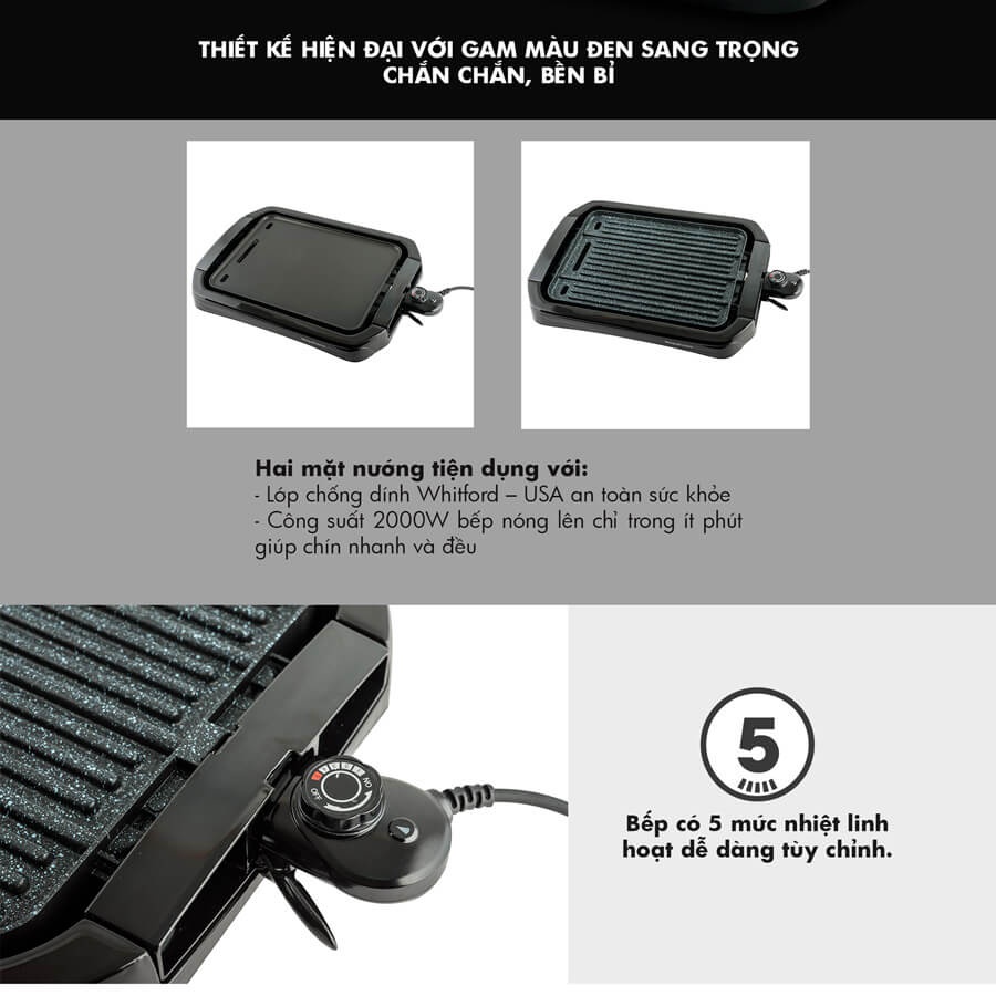Bếp nướng điện có 5 mức nhiệt linh hoạt để bạn tùy chỉnh theo từng món ăn. Bề mặt bếp rộng giúp nướng được lượng thực phẩm nhiều hơn, thích hợp sử dụng cho gia đình có từ 2 - 6 người.