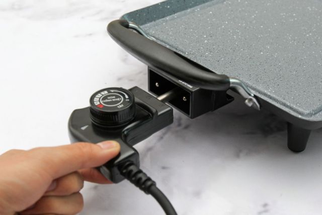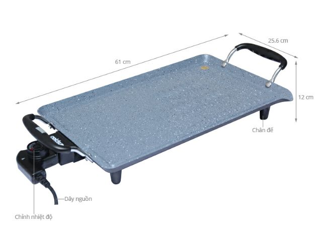 Tay cầm bằng thép bọc nhựa bakelit , khay tráng chống dính, khay nướng tiếp xúc trực tiếp với thức ăn giúp thức ăn chín nhanh hơn.