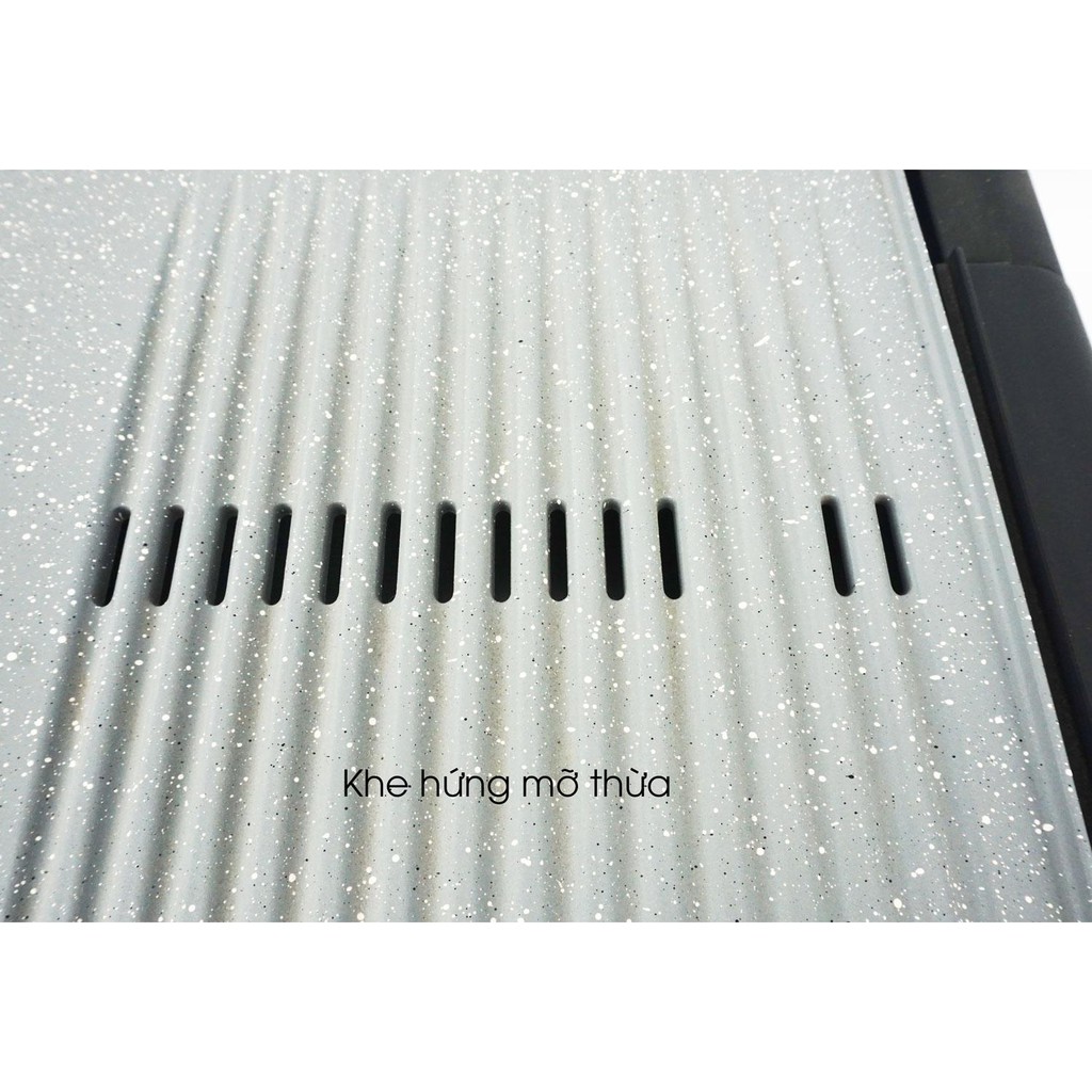 Trên mặt nướng có lỗ nhỏ để mỡ thừa chảy xuống khay chứa được trang bị ở phía dưới. Khay chứa thiết kế nhỏ gọn, có thể tháo rời dễ dàng rất thuận tiện cho bạn trong việc vệ sinh sau khi sử dụng.