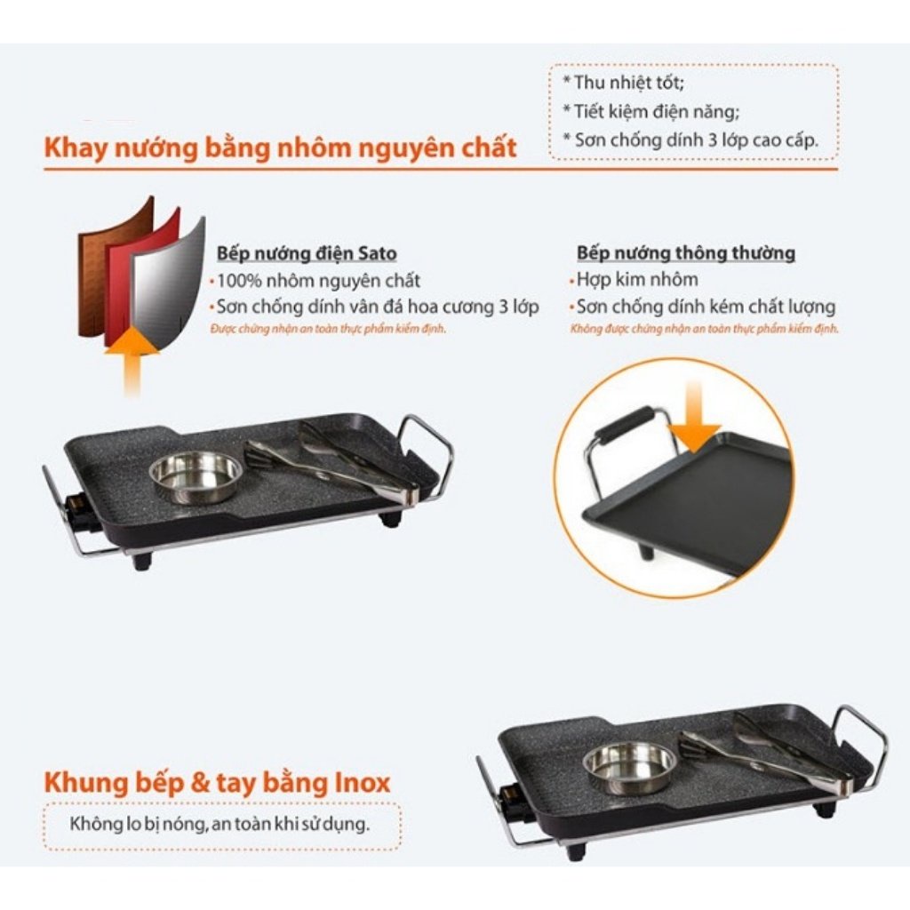 - Bếp nướng điện Sato thiết kế màu đen phối ghi xám dễ vệ sinh. Đáy bếp thiết kế dày dặn, giữ nhiệt lâu, điều chỉnh được nhiệt độ nướng ở nhiều mức giúp tiết kiệm điện năng tiêu thụ.