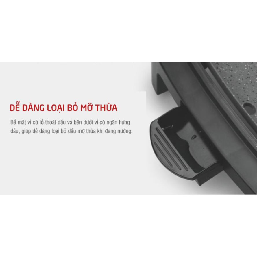 Bề mặt Bếp nướng có lỗ thoát dầu và bên dưới Bếp có ngăn hứng dầu, giúp dễ dàng loại bỏ dầu mỡ thừa khi đang nướng. Đồng thời, vỉ nướng được đính kèm theo giá đỡ, giúp nâng một bên Bếp nướng (bên cắm bộ điều nhiệt) cao hơn bên còn lại (bên có lỗ thoát dầu) để dầu mỡ có thể dễ dàng chảy về phía lỗ thoát dầu, vừa mang lại món ăn ngon, vừa đảm bảo an toàn sức khỏe cho bạn và những người thân trong gia đình.