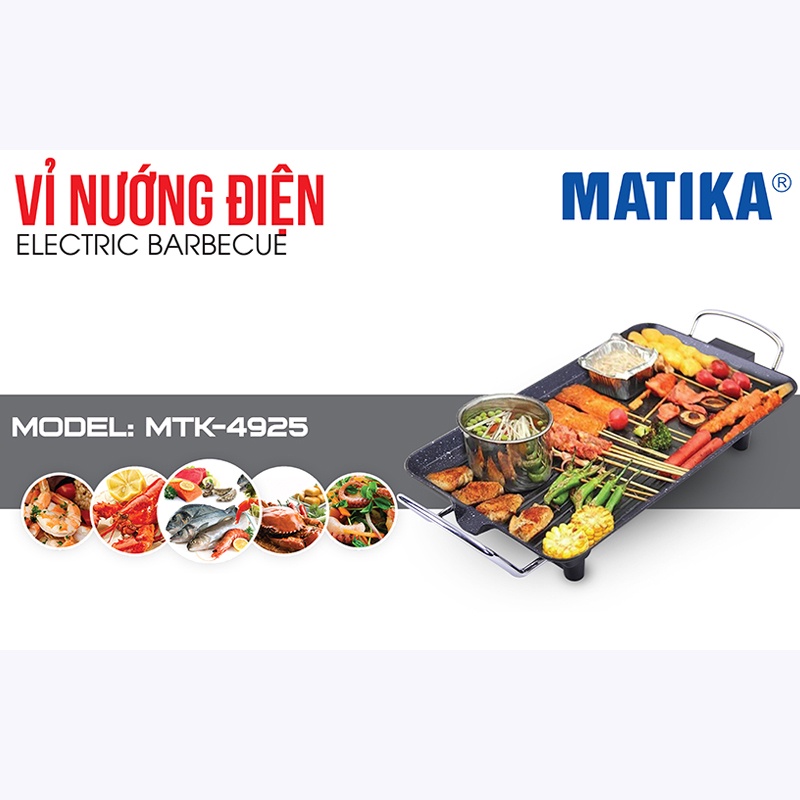 Bếp Nướng Điện MATIKA 1500W MTK-4925Bếp nướng điện không khói Matika MTK-4925 sở hữu thiết kế sang trọng, kiểu dáng gọn nhẹ dễ dàng di chuyển, lớp chống dính đá hoa cương cao cấp giúp bạn thỏa sức chế biến và thưởng thức những món nướng thơm ngon cho cả gia đình.