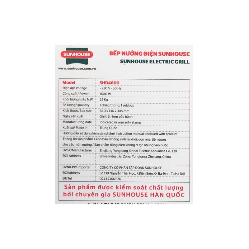✔️✔️✔️ THÔNG SỐ KỸ THUẬT Bếp nướng điện SUNHOUSE SHD4600, Bếp nướng Sunhouse SHD4600