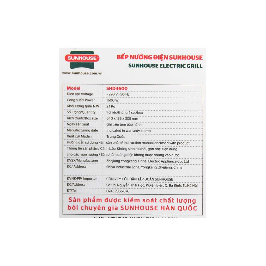 Bếp nướng điện SUNHOUSE SHD4600 - Hàng Chính Hãng