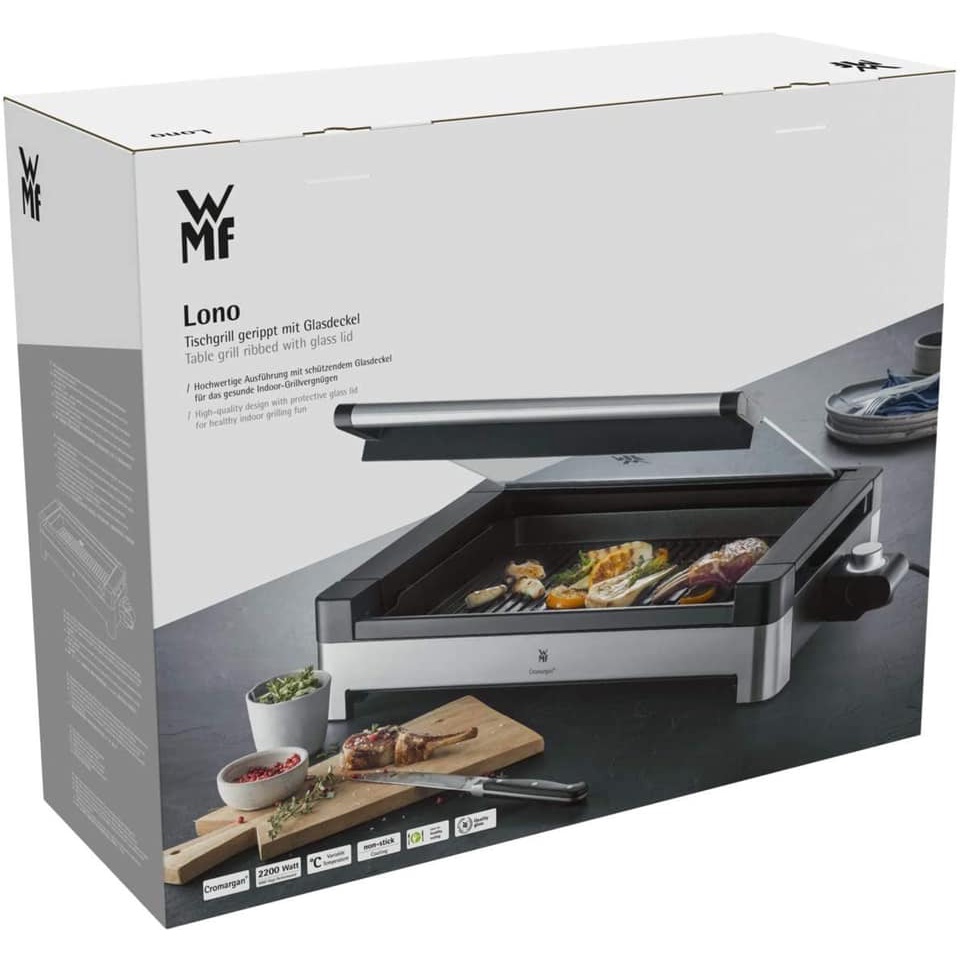 Model mới 2021 BẾP NƯỚNG ĐIỆN WMF LONO có nắp kính về hàng- Chất liệu vỏ Cromangan bóng mờ sang trọng và bền bỉ.