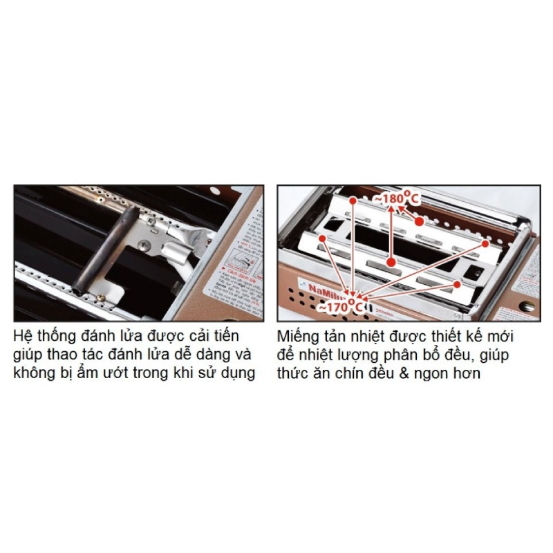 Bếp nướng gas hồng ngoại Namilux NA-24N này được thiết kế dựa trên kiểu dáng của chiếc bếp gas thông thường với kích thước hình chữ nhật. Tuy nhiên, thay vì bề mặt là chiếc kiềng bếp thì nó lại có vỉ nướng băng thép sơn tĩnh điện phía trên. Phía dưới có 2 đầu đốt chạy dọc giúp chia lửa đều và nhanh hơn đến những phần thực phẩm cần nướng. Rất tiện dụng phải không nào? Để gia đình có những bữa ăn ngon thì việc chuẩn bị và sắm sửa đầy đủ các vật dụng thật cần thiết. Không chỉ chế tạo ra những chiếc bếp gas nấu an toàn, bền chắc mà Namilux còn mang đến cho người tiêu dùng một loại Bếp nướng gas hồng ngoại Namilux NA-24N chuyên dụng. Sản phẩm sẽ hỗ trợ tối đa cho những bữa tiệc gia đình.