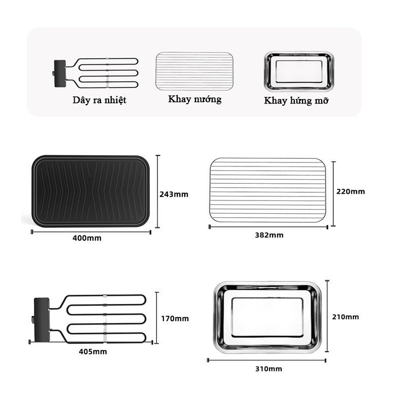 * Khay nướng bằng chất liệu hợp kim dẫn nhiệt tốt giúp đồ ăn chín đều và nhanhiện. Sau đó làm khô bằng cách lau lại bằng một chiếc khăn khô. Chú ý phải đảm bảo đế điện phải hoàn toàn khô. Không dùng những vật thô, cứng để làm sạch. Phần thân của khay nướng phải được đặt dưới đất.