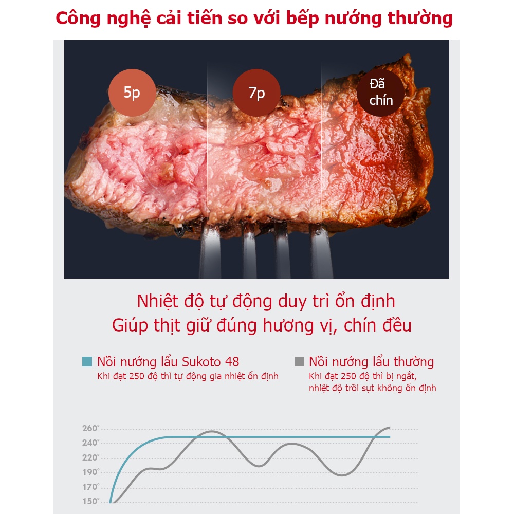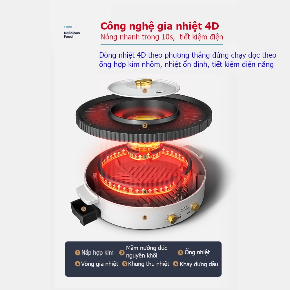 Công nghệ nhiệt 4D được thiết kế tối ưu về nhiệt độ, giúp nướng lẩu nhanh hơn, nhiệt độ ổn định hơn giúp thịt cá thức ăn chín đều và giữ được hương thơm đúng vị.