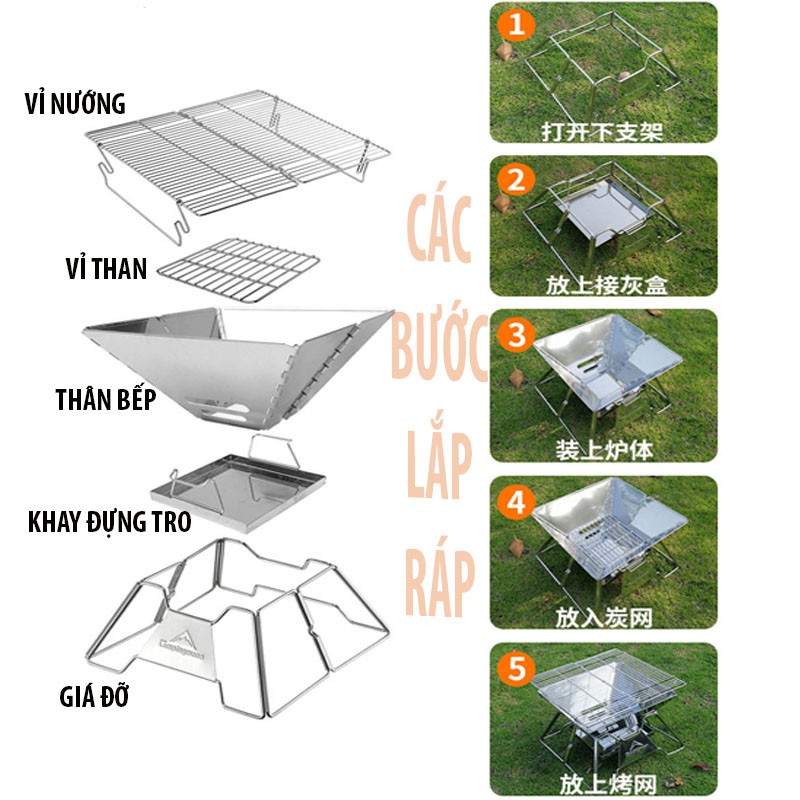 - Bộ sản phẩm gồm : Vỉ để than, chân đỡ, mặt đế, thân bếp, vỉ nướng