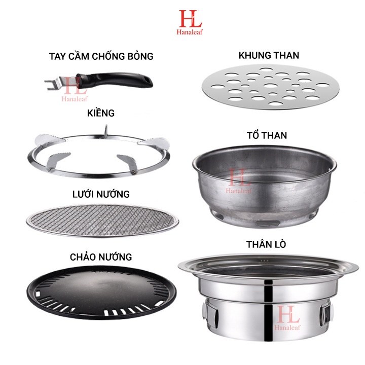 - Bộ sản phẩm bao gồm: Thân lò, tổ than, khung than, chảo nướng, lưới nướng, tay cầm chống bỏng