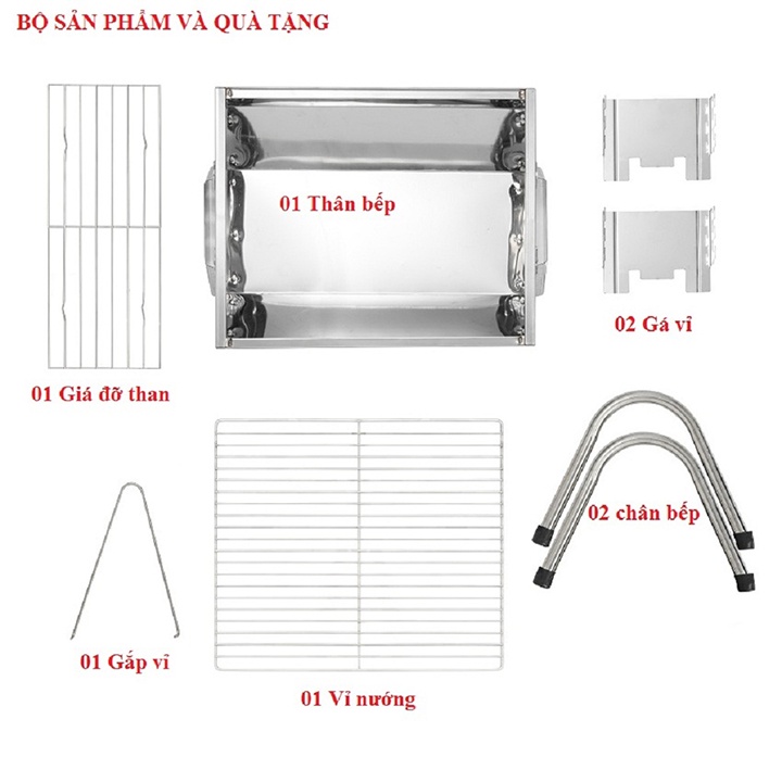 - Trọn bộ sản phẩm BẾP NƯỚNG THAN HOA INOX CHÂN CAO NGOÀI TRỜI bao gồm: