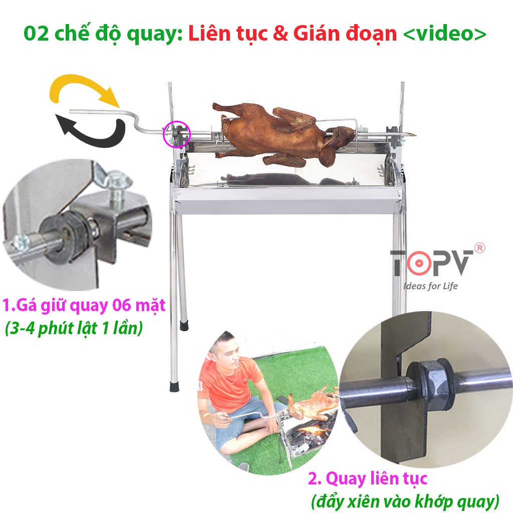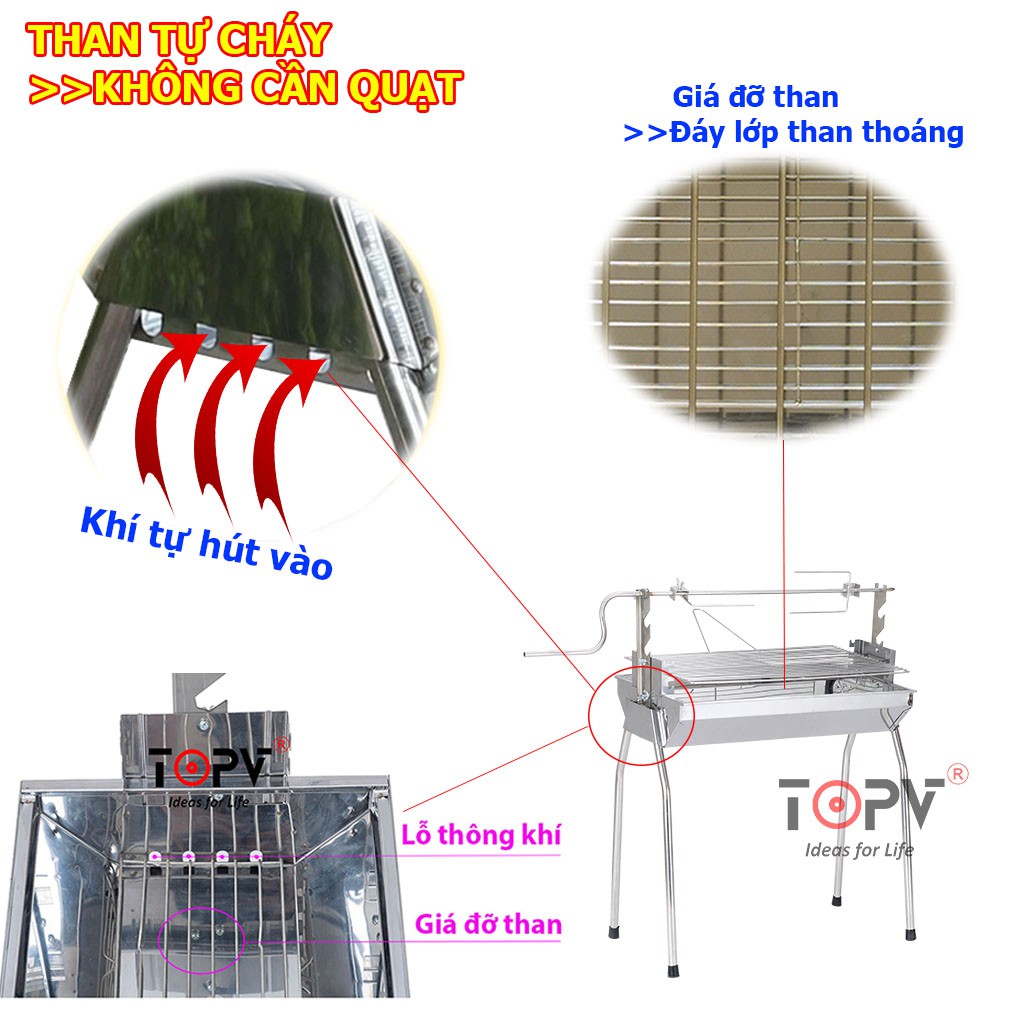 2. Đặc biệt với thiết kế sáng tạo Bếp nướng than hoa đa năng TopV DNM cho phép thay đổi độ cao của vỉ và xiên quay so với mặt than nhằm tối ưu nhiệt độ nướng. Giúp thức ăn chín đều mà không sợ cháy thực phẩm