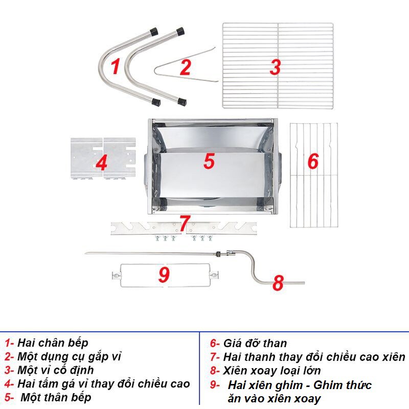• Các bộ phận lắp ráp đơn giản; và có thể tháo dỡ, sắp xếp gọn gàng vào thân bếp. Vì vậy dễ dàng mang đi di chuyển nướng ngoài trời hoặc cất gọn khi không sử dụng.