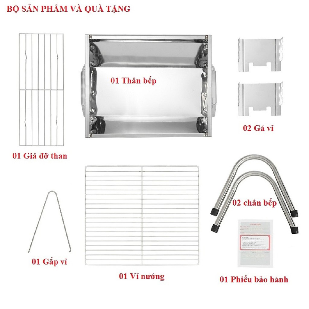 - Sản phẩm bao gồm: 1 thân bếp,1 vỉ than, 1 vỉ nướng. 2 chân đứng, 1 gắp than,2 tấm thay đổi chiều cao vỉ