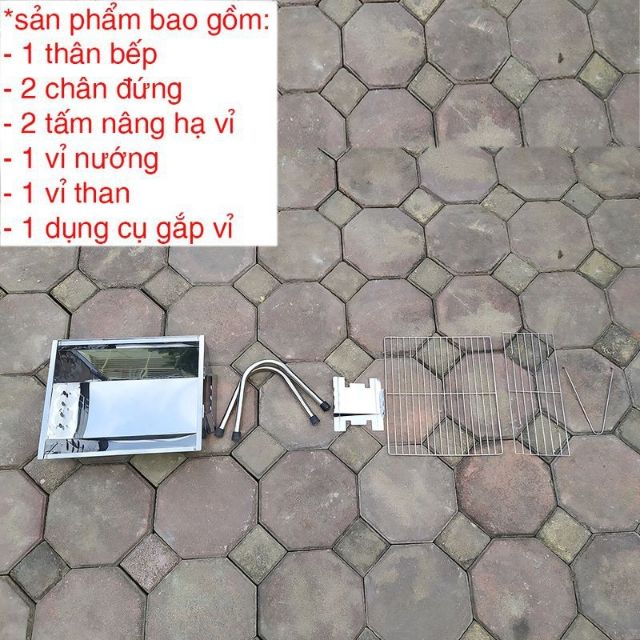 - Sản phẩm bao gồm: 1 thân bếp,1 vỉ than, 1 vỉ nướng. 2 chân đứng, 1 gắp than,2 tấm thay đổi chiều cao vỉ