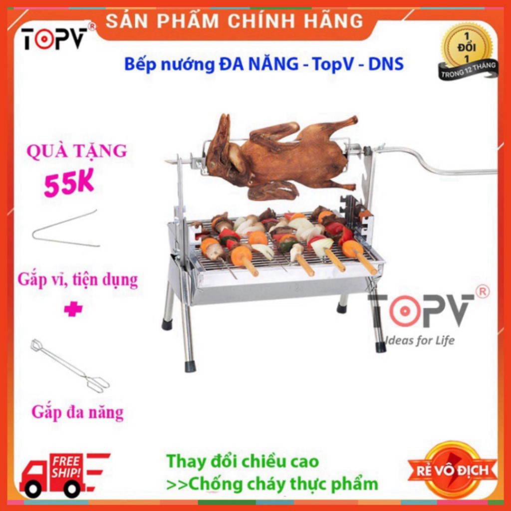 Bếp nướng than hoa ngoài trời 2 in 1 TopV DNS, lò nướng than hoa không khói, nướng thịt, nướng gà vịt có thiết kế thông minh để đồng thời nướng vỉ và xiên quay cỡ lớn, tùy ý thay đổi độ cao vỉ và xiên, chống cháy thực phẩm, có chế độ giữ nóng thức ăn khi đã chín.