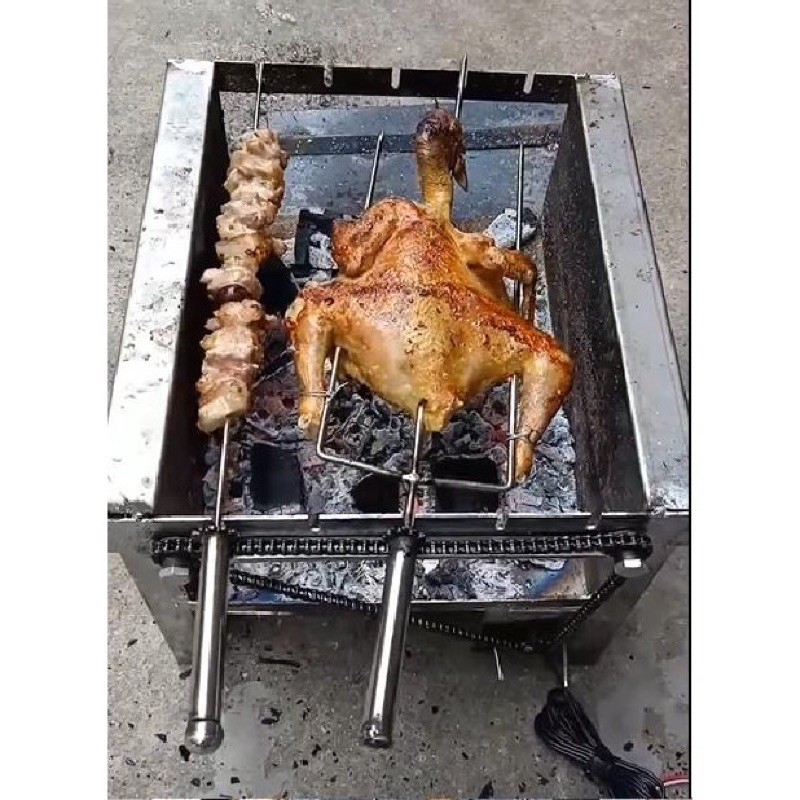 ➡️ Nguyên tắc hoạt động: Dùng mô tơ giảm tốc 15w - Điện 220v - Tốc độ quay đều chậm, để thịt chín đều.