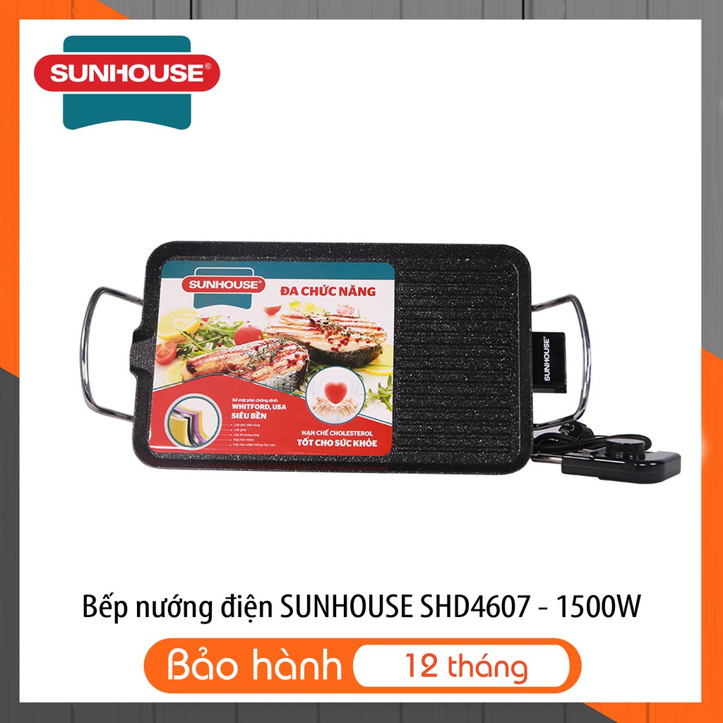 - Bếp nướng điện Sunhouse SHD4607 có mặt bếp rộng, công suất 1500 W, nướng chín thức ăn nhanh, ít tốn điện