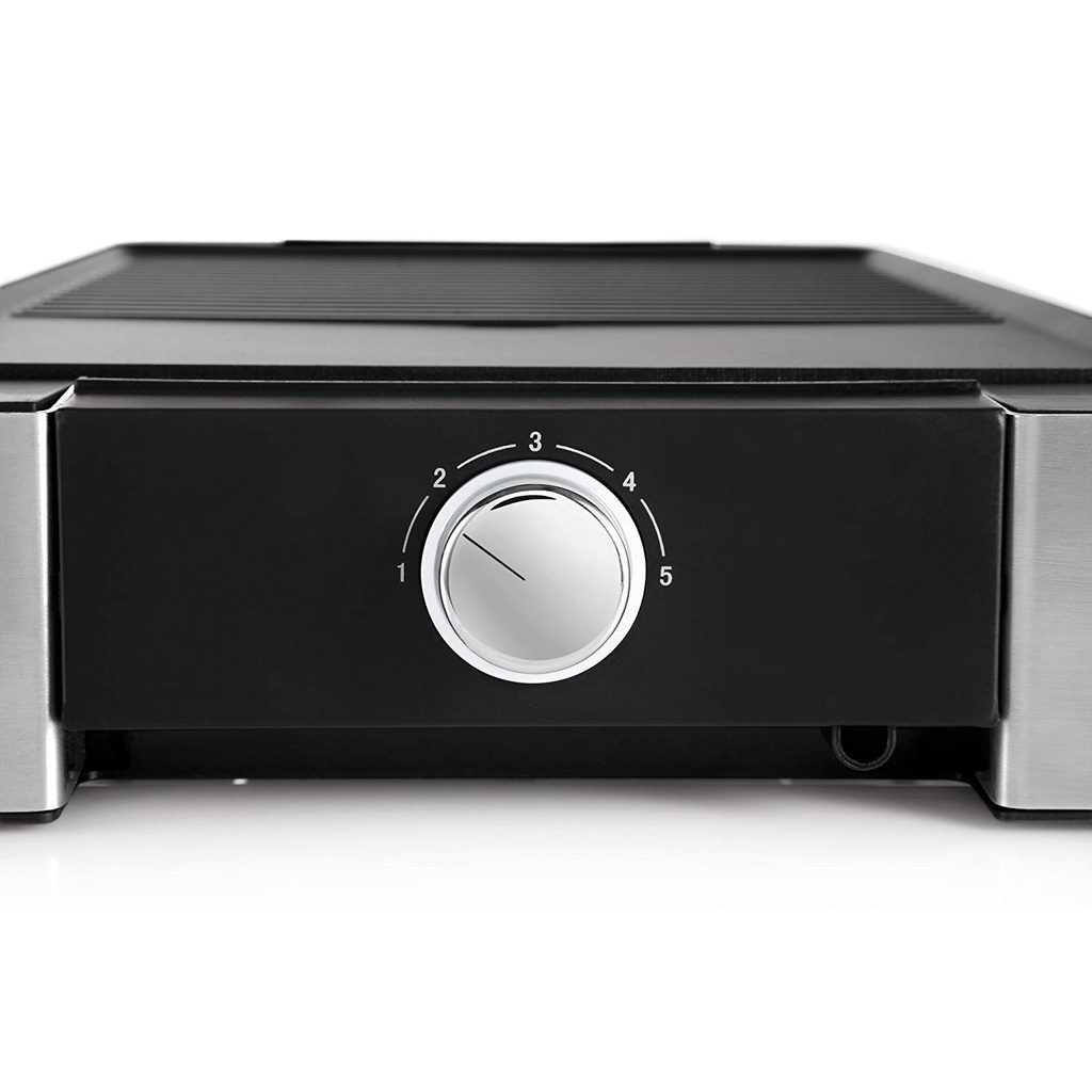 - Bếp nướng có mặt nướng làm bằng nhôm đúc nguyên khối cao cấp. Viền xuong quanh trang trí làm bằng chất liệu Cromargan matt chất lượng cao. Bề mặt có gân lớn và mặt phẳng nướng xấp xỉ 27 cm x 41 cm (khoảng 1100 cm²).