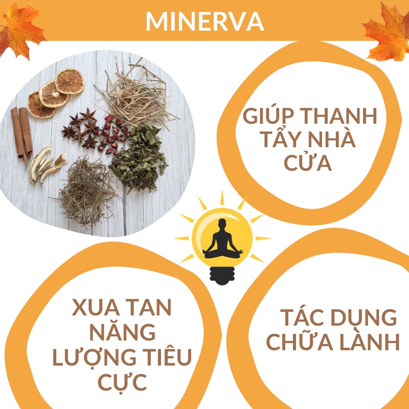 - Gói thảo mộc gồm 8 loại, cân nặng 30 gram. Bao gồm cam khô, quế khô, vỏ bưởi, đại hồi, hương thảo, bạc hà, sả khô. Shop cho thêm một chút đầu hoa hồng tạo cảm giác thư giãn dễ chịu, chắc chắn sẽ mang đến một cảm giác thư thái thanh mát cho ngôi nhà của bạn