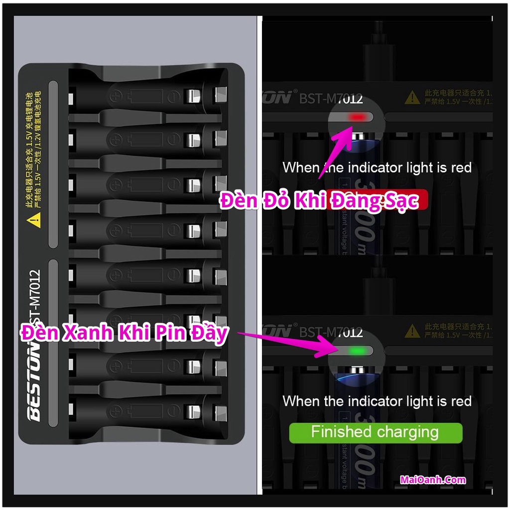 - Bộ sạc 8 khe thông minh tự ngắt khi pin đầy Beston BST-M7012 chỉ có thể sạc cho pin Li-ion 1.5V, không thể sạc cho pin Niken (Ni-MH) 1.2V được. Vì điện áp pin 1.2v khi đầy nó chỉ tầm 1.45V, không đạt được điện áp ngắt sạc.