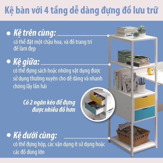 Với mẫu bàn này, bạn có thể dễ dàng lấy được các tài liệu, đồ dùng, sách vở cần thiết mà không cần phải đứng lên nếu kết hợp với một chiếc ghế xoay 360 độ.