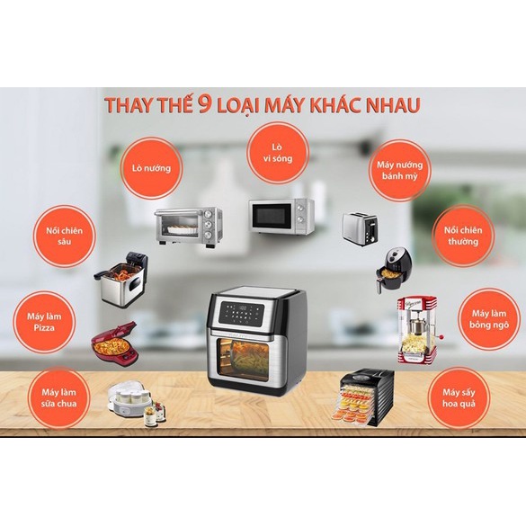 – Chiếc nồi chiên có thể giúp tiết kiệm tiền và không gian khi thay thế 9 loại thiết bị bếp khác nhau như lò nướng , nồi chiên , máy nướng Pizza, máy nướng bánh mì, máy làm bỏng, máy ủ sửa, máy sấy hoa quả, nồi chiên sâu, lò vi sóng...)
